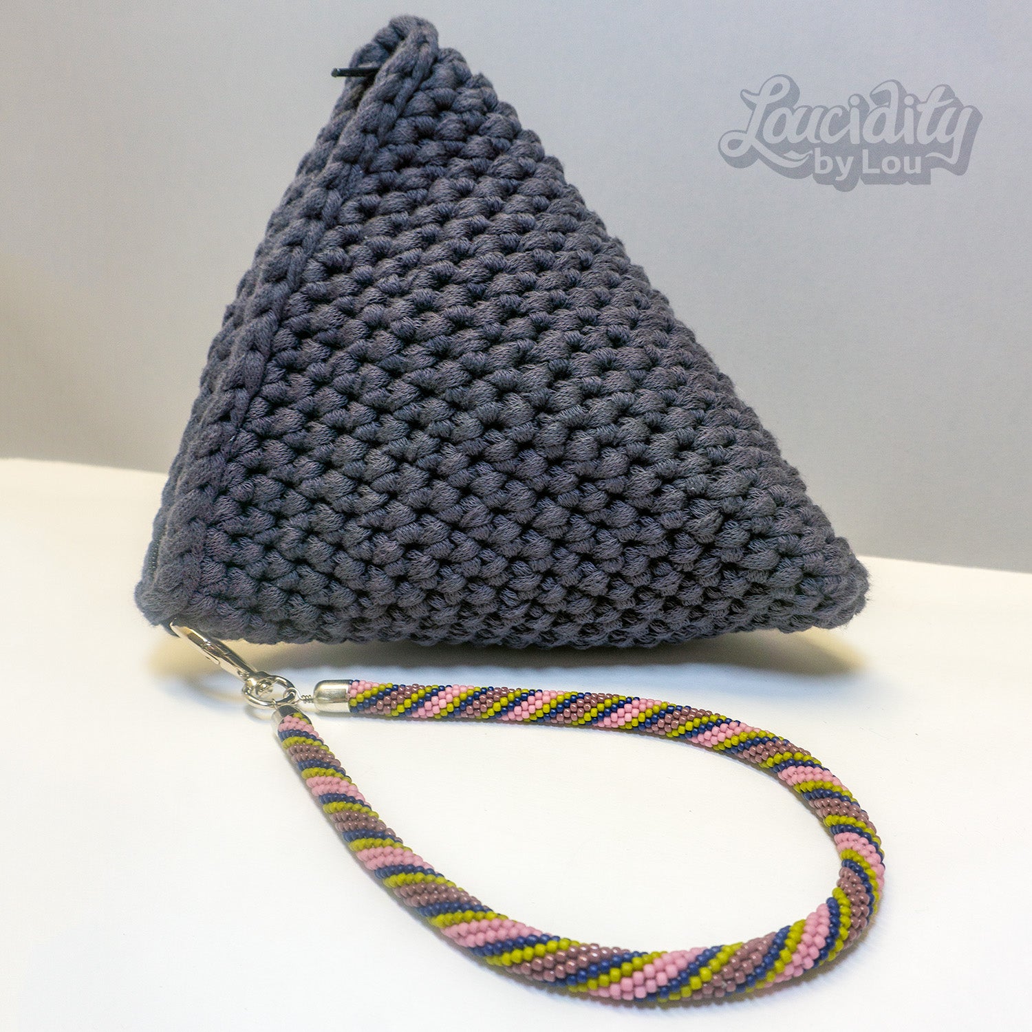 Be an original! Large enough to fit all your essentials, this pyramid crochet clutch is a statement piece. The cool triangle shape is unique and stylish. Easily switch out the wristlet lanyard for a different look or remove it completely.